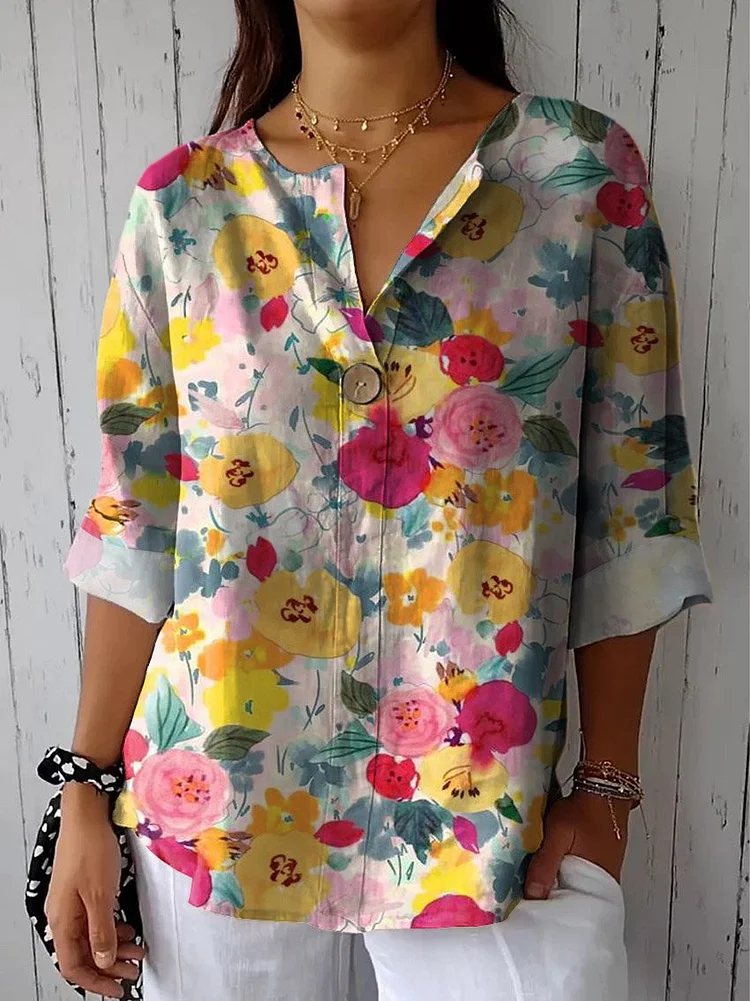 Summer Casual Loose Slit V-Neck Printed Faux Linen Dress