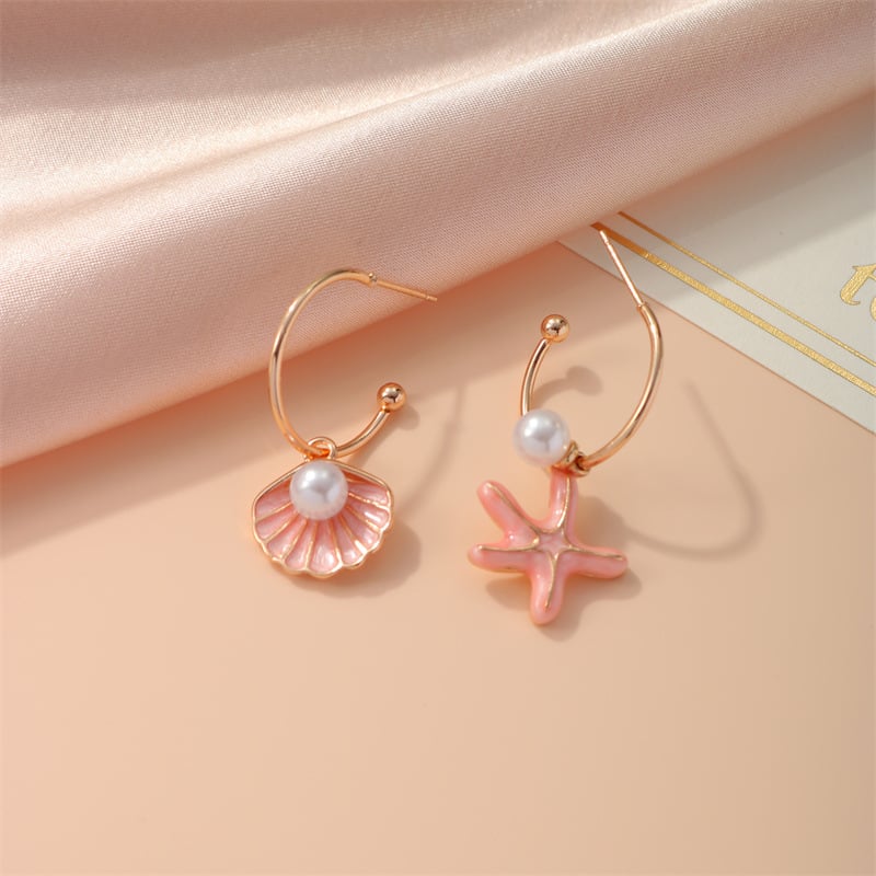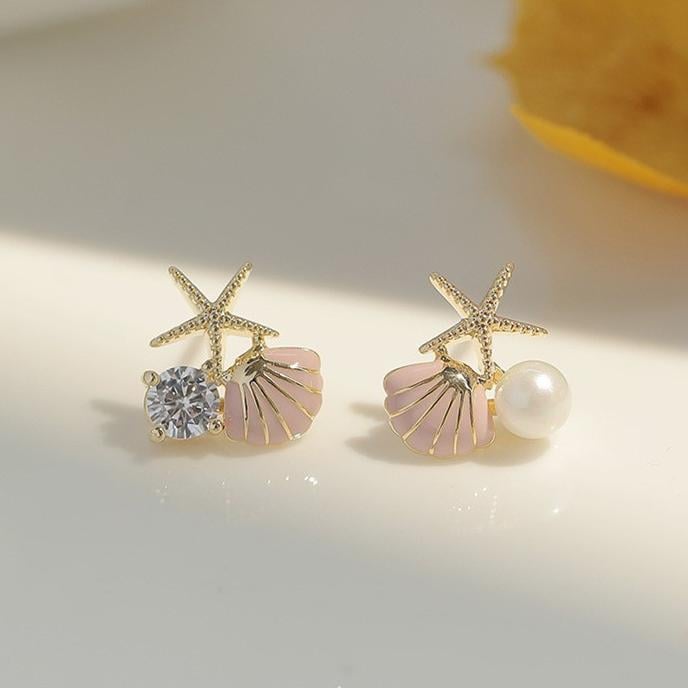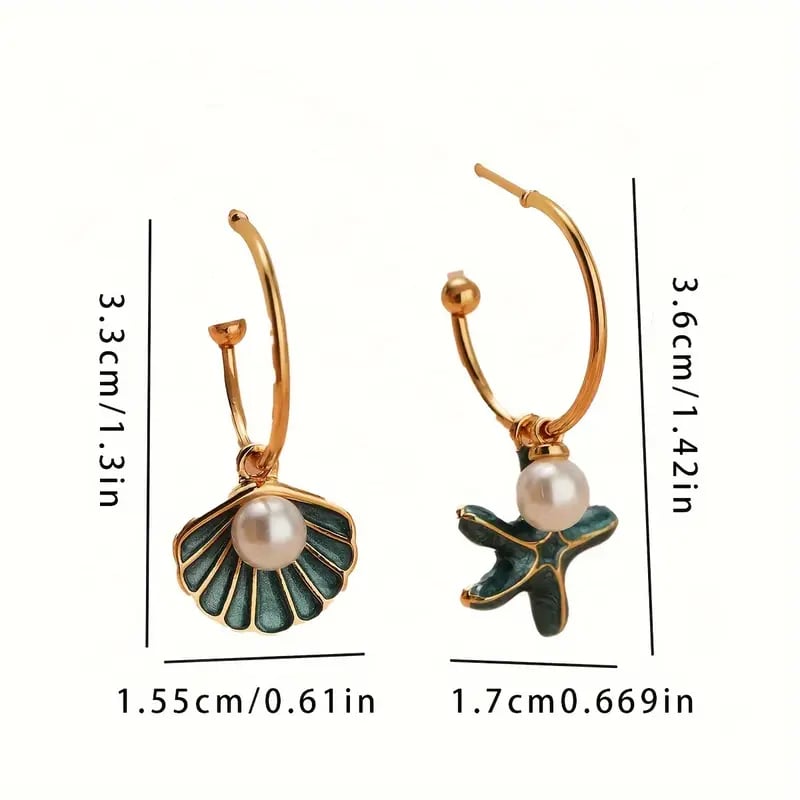 One earring features a golden-rimmed shell. the other a graceful starfish—both accented with a pearl for a unique asymmetrical look.