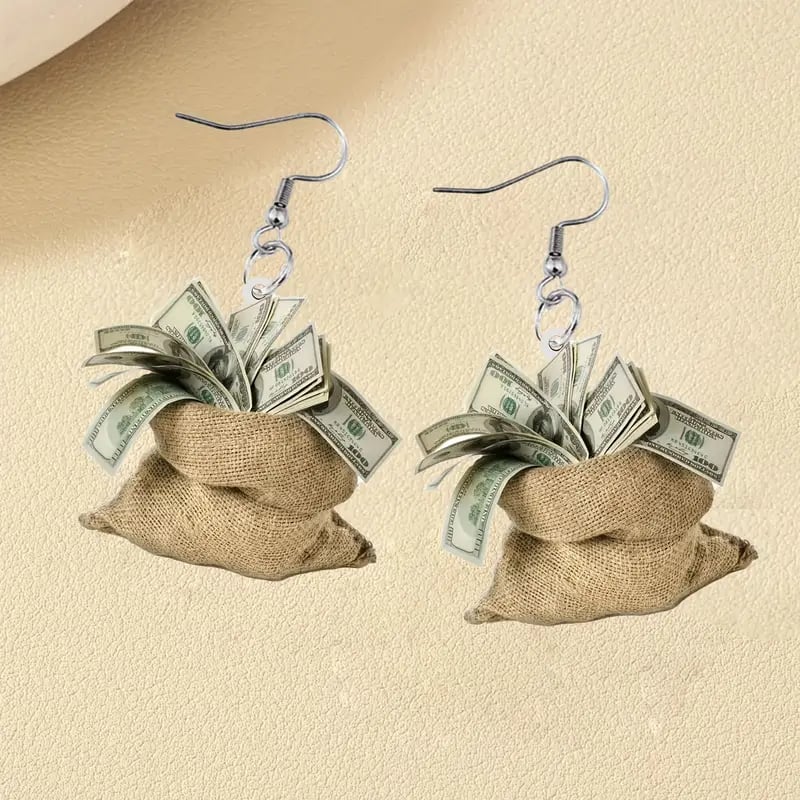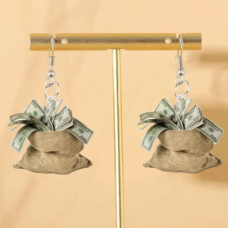 Designed to look like tiny money bags overflowing with cash. these earrings are the ultimate way to add humor and charm to your outfit. They’re perfect for anyone who loves to make a statement with their accessories and show off their quirky side.