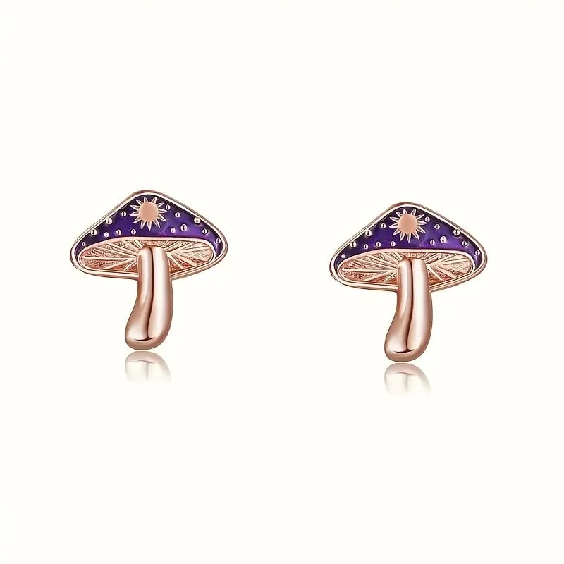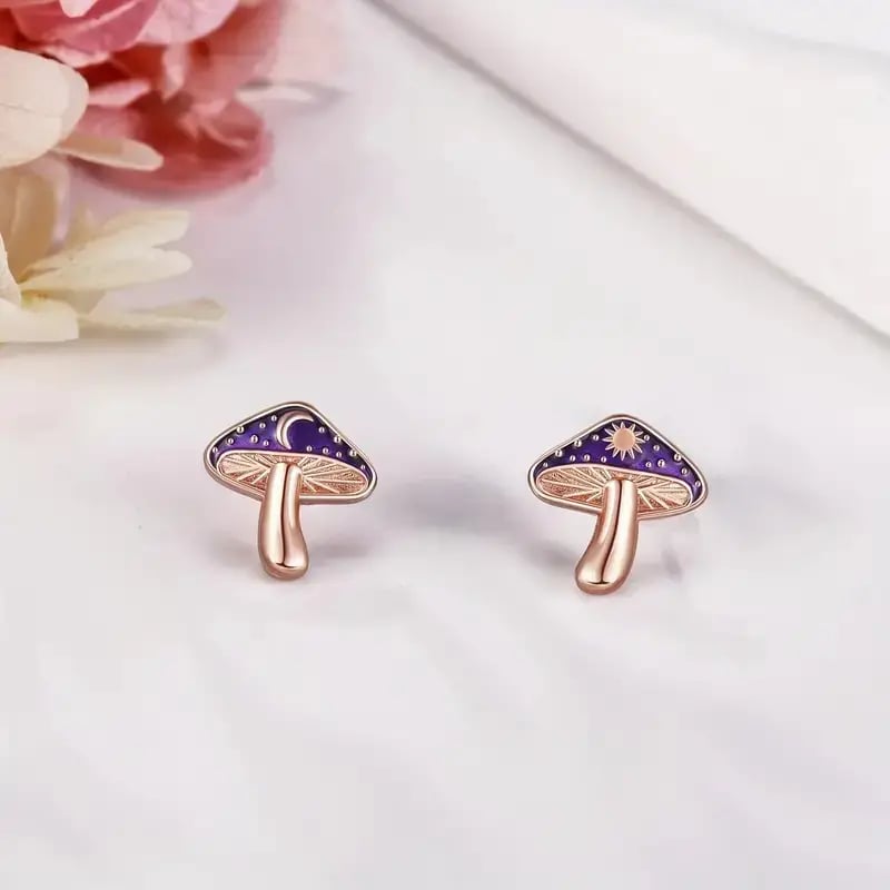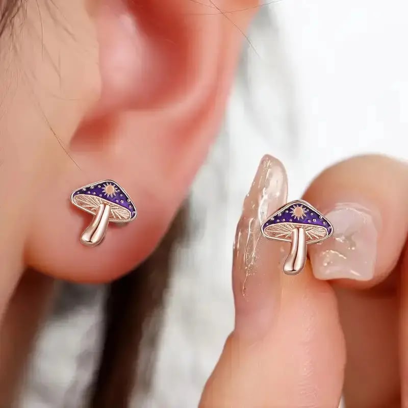 🍄These enchanting mushroom studs feature deep purple caps with golden star accents. resembling a starry night reflected on water. Playful yet elegant. they add magic to your everyday style.